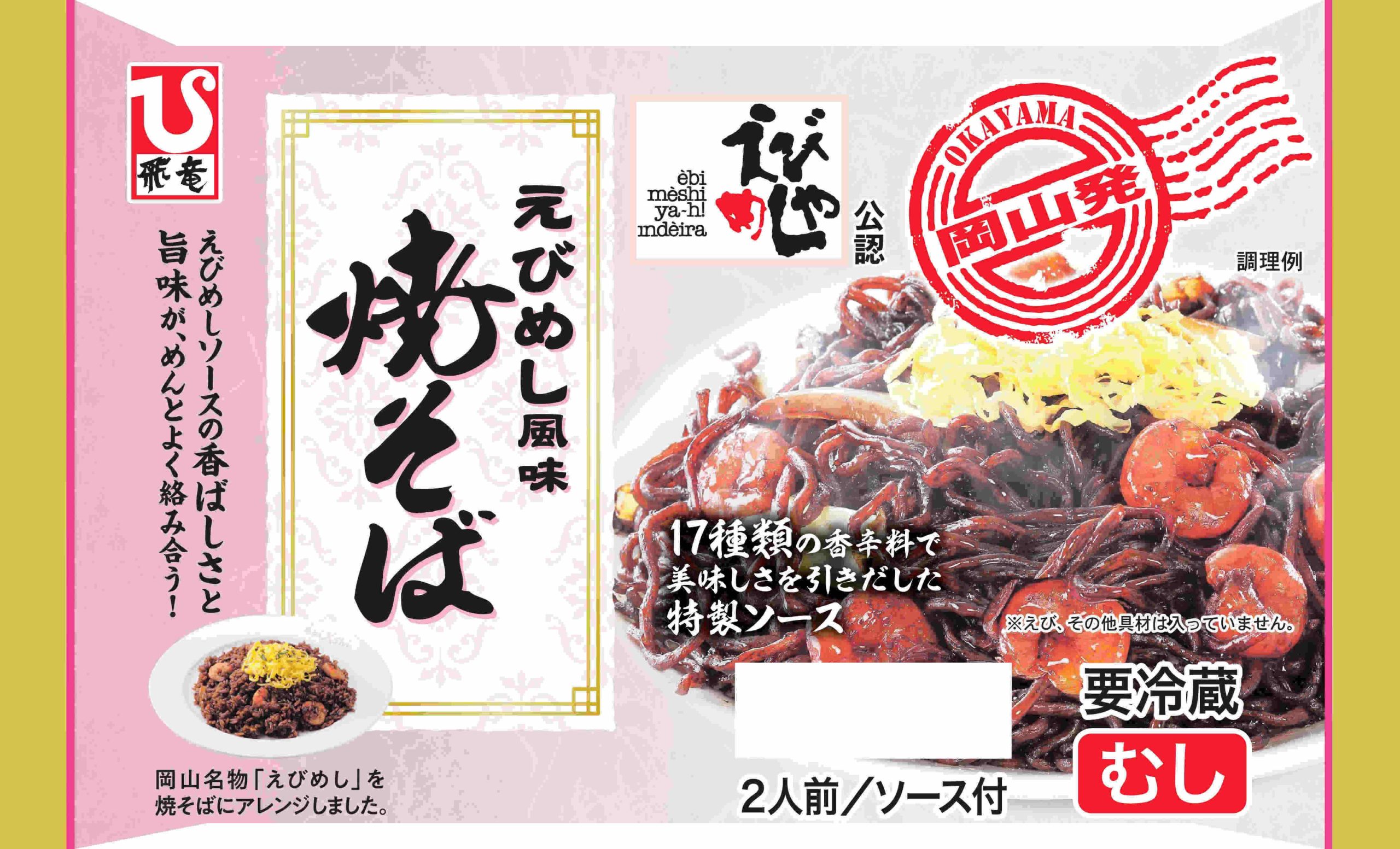 飛竜の新商品の「えびめし風味焼そば」の販売が決定しました。 3/1より新発売。 岡山県のソウルフード「えびめし」を焼そばにアレンジした商品が販売となります。 コシのあるむし焼そば麺に「いんでいら公認」の濃厚で旨みのブラックソースが付いた商品です。 宜しくお願い致します。
