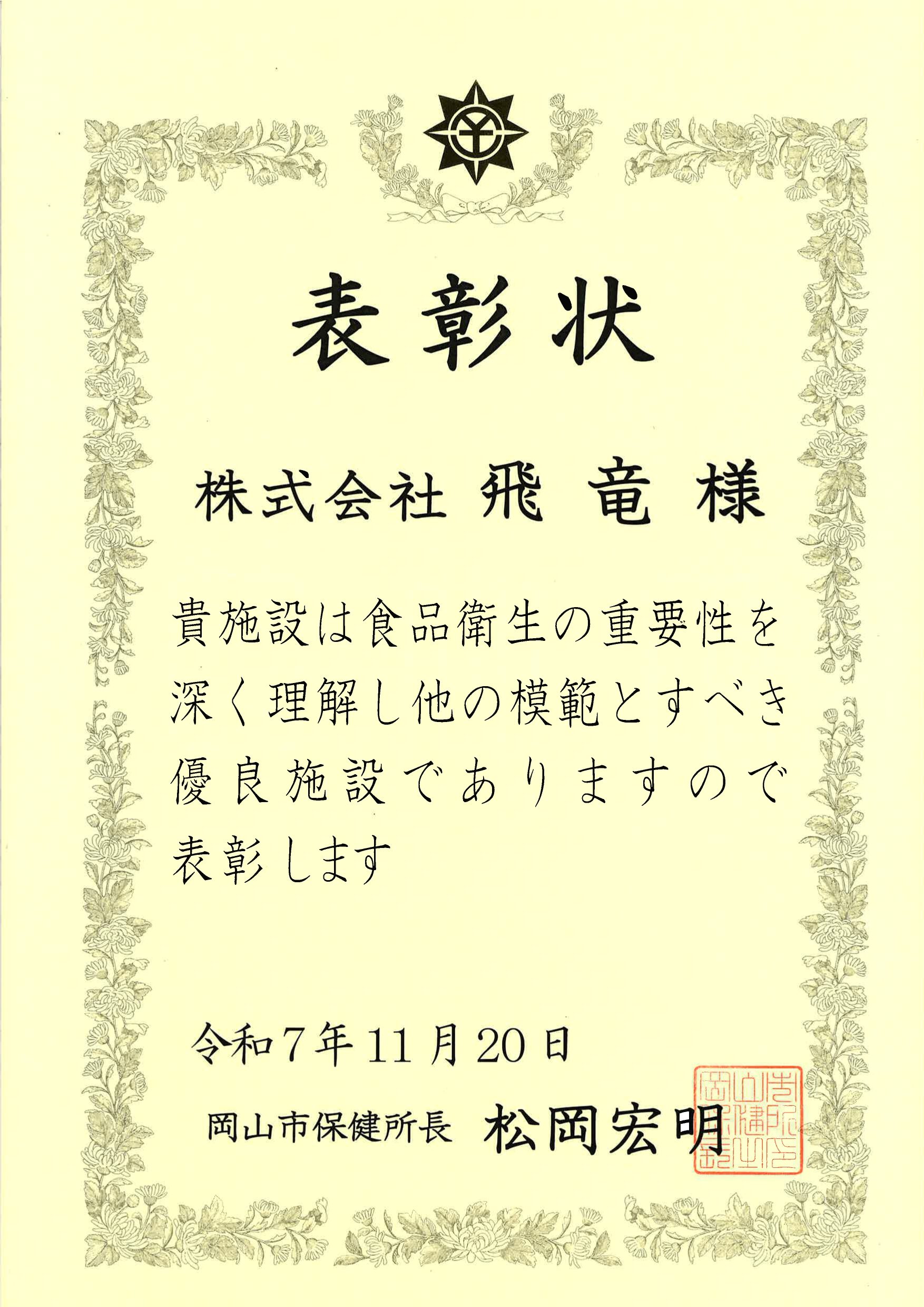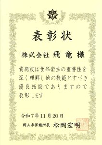 飛竜の工場が、令和7年度における「食品衛生優良施設」として、岡山市の表彰を受けました。 飛竜の工場が、令和7年度における「食品衛生優良施設」として、岡山市の表彰を受けることになりました。 保健所長表彰になります。 保健所長表彰は、施設の表彰としては、年に2施設ほど選ばれます。 これからも安心安全で美味しい商品をお届けいたします。